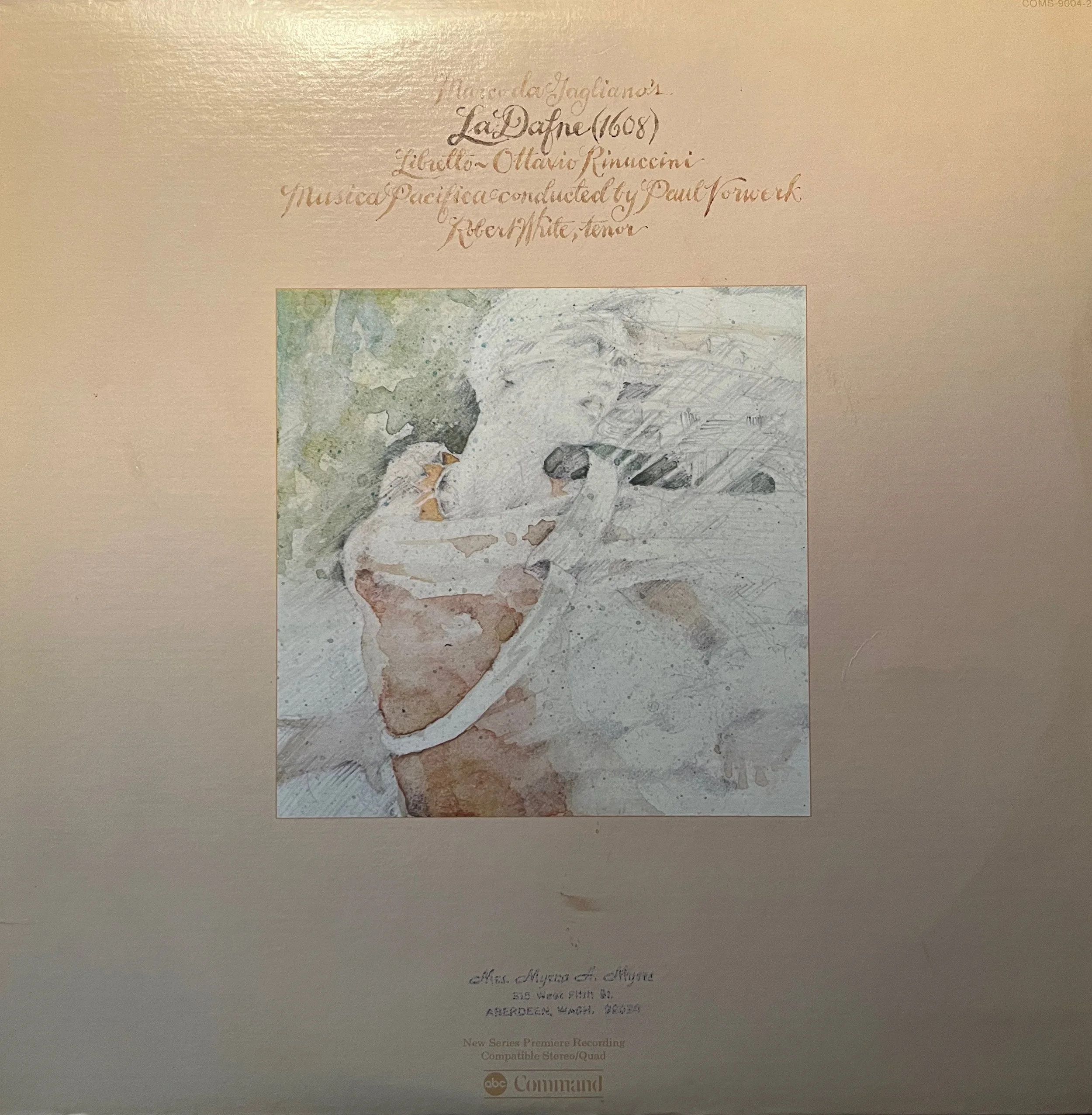 Marco da Gagliano, La Dafne, Ensemble Musica Pacifica; Paul Vorwerk, conductor; COMS 9004-2; reissue AB 6 70 12/2; 1975. Record World Critics Award: Best Album of the Year Featuring Music Pre-1700, 1975. Grammy Award Nomination, 1975.