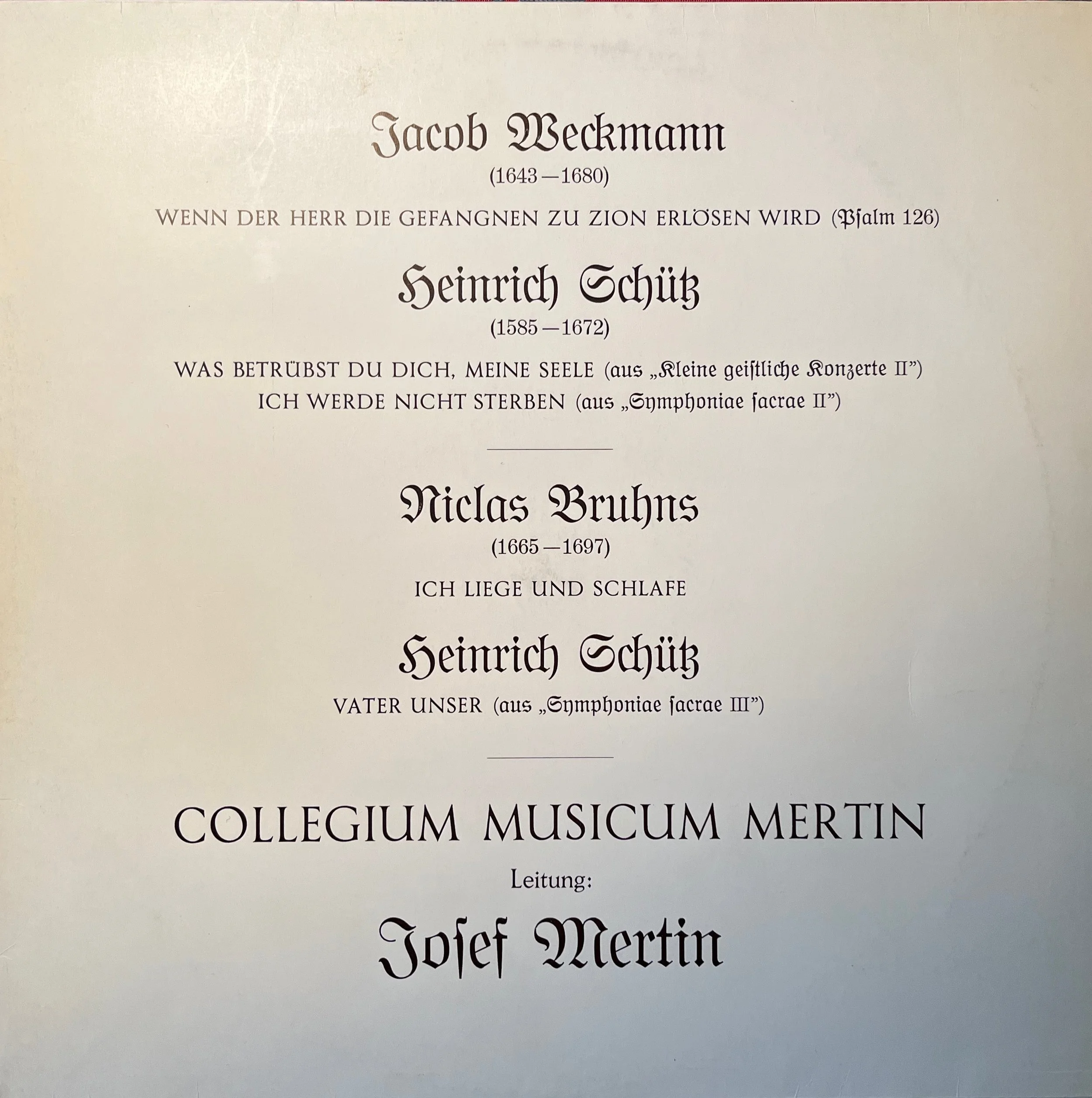 Bruhns and Schütz Cantatas, soloists: Mary Ann Hart, F. Urrey, M. Myers, Collegium Musicum Josef Mertin; EX 93; 1989 (see Concerts - Osterakademie).
