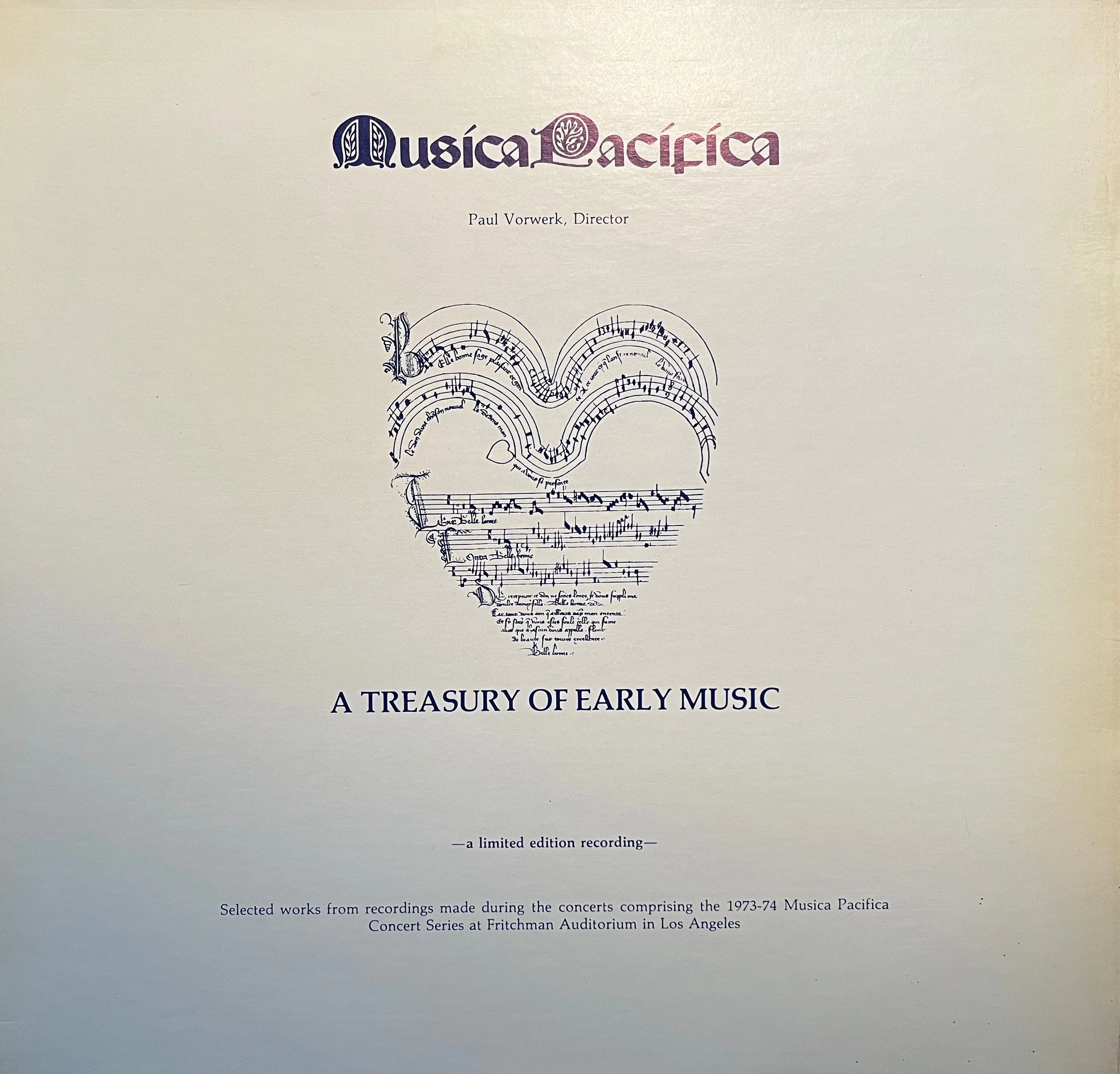 A Treasury of Early Music (limited edition recording), selected works from recordings made during the concerts comprising the 1973-1974 season.
